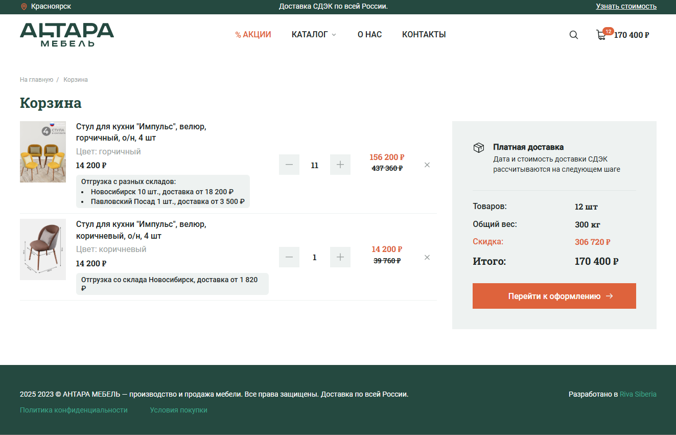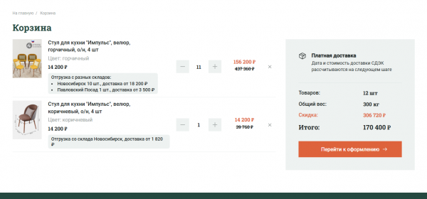 Объединили страницу корзины со страницей оформления заказа https://vm.trade/, подключили доставку СДЭК - в зависимости от статуса клиента (опт / розница) изменяется и функциональность корзины.