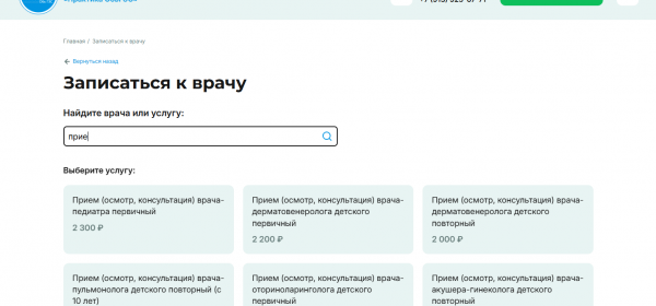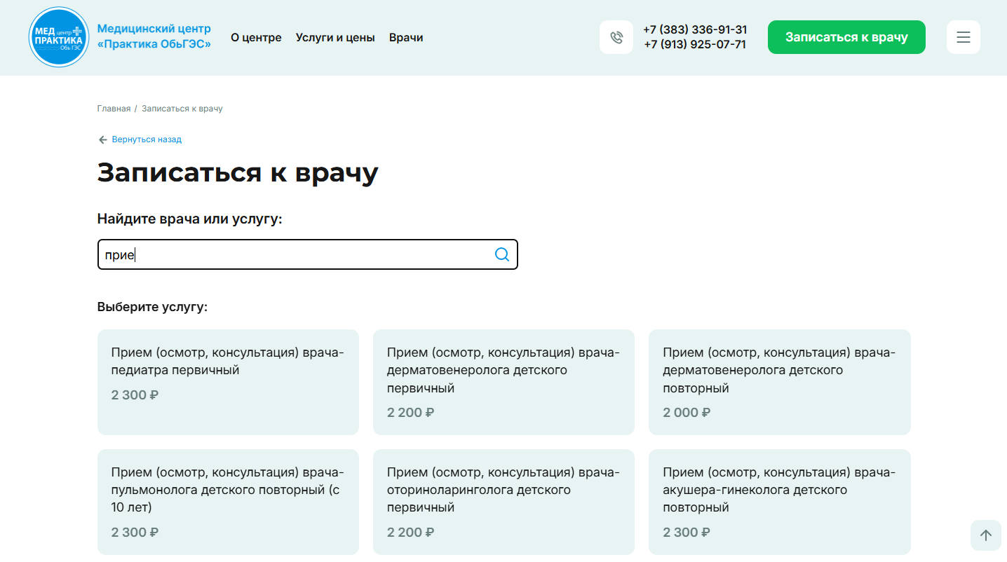 Обновили сайт Медицинского центра «Практика ОбьГЭС» с онлайн записью к специалистам и интеграцией с Rest API 1С.