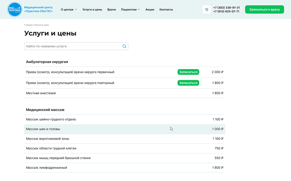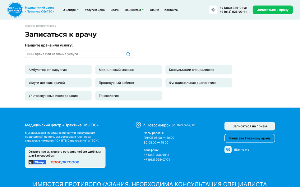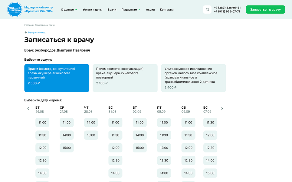 На сайте реализована онлайн-запись к конкретному специалисту или на определенную услугу, либо можно выбрать направление, а уже в нем записаться на услугу из списка. Техническая реализация - интеграция с Rest API 1С.